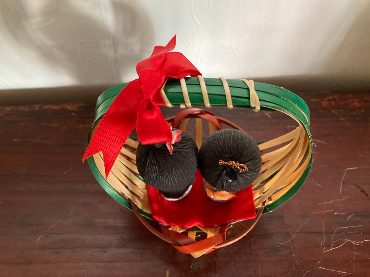 These are handmade Japanese washi paper dolls in a charming basket, crafted to look like temari (traditional Japanese handballs) and children engaged in omamagoto (playing house).