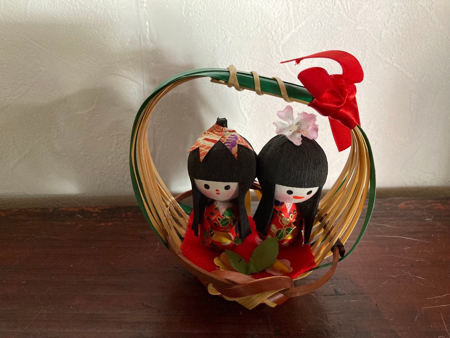 手作りの和紙人形。かご入り「てまり」(男の子と女の子)「おままごと」(女の子と女の子)です。